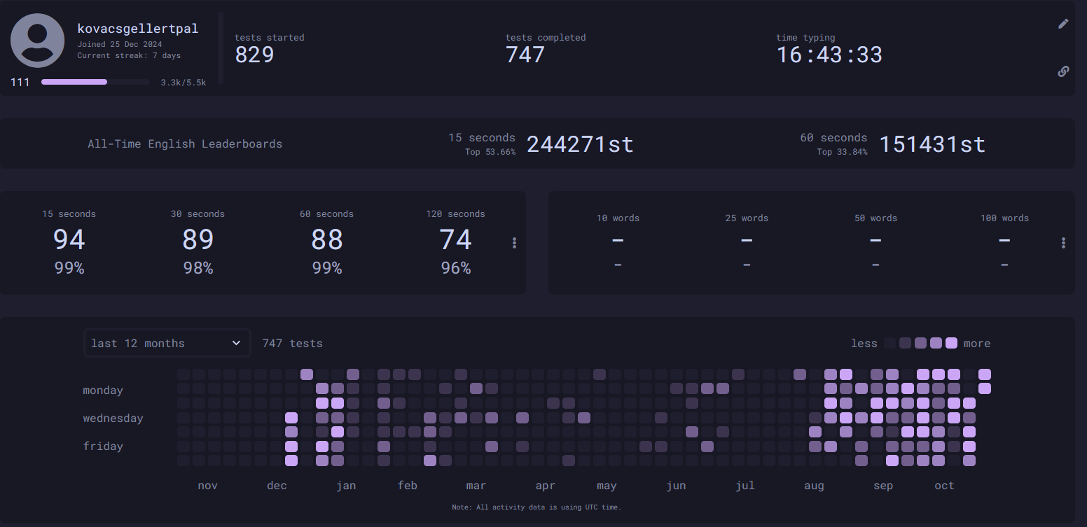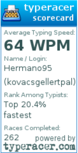 At the moment of writing I'm almost top 20% on TypeRacer and top 34% percent on MonkeyType in the 60 seconds English test. I'm not stopping, but I'll attach some pictures of my stats as I feel like bragging a bit about my achievements until now. I'll continue with ~10 minutes daily practice sessions for a few more months and I'll probably post an update in a new post.