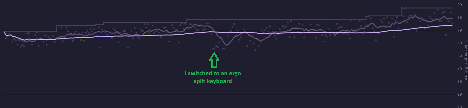 After finishing all the TypingClub I was finally able to touch type faster than my original hunt-and-peck speed, at around 45 WPM. I continued with MonkeyType and TypeRacer and here I am at the end of 2025: I'm averaging 60-80 WPM depending on the type of text. After almost two years there is still much to improve, but at least I can finally see the light at the end of the tunnel. 😄